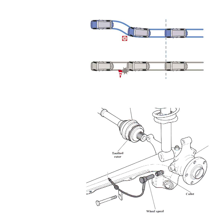 ABS (Anti-lock braking system) wheel speed sensor sends a signal to the ABS controller reporting wheel speed.